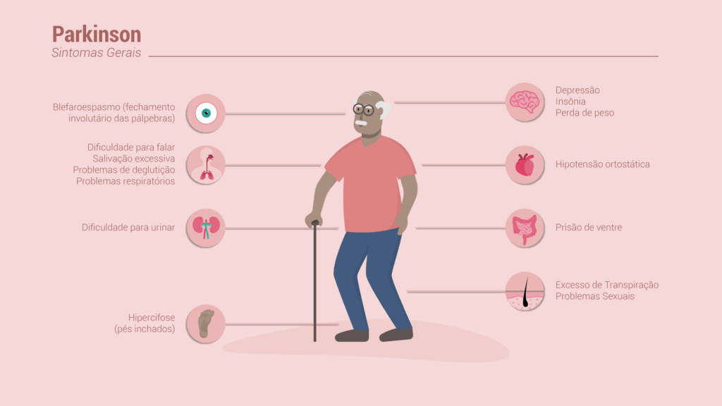 Além disso, os pacientes podem apresentar diminuição do olfato, alterações do sono, mudanças de humor, urgência urinária ou incontinência, dor corporal e fadiga. Outro dado relevante é que cerca de 30% dos indivíduos diagnosticados desenvolvem demência associada ao quadro clínico.