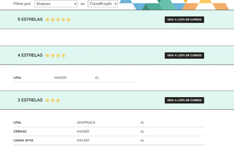 Receberam 3 estrelas, classificação correspondente a “Bom”, os cursos da UFAL (Campus Arapiraca), do Cesmac (Maceió) e da Unima Afya (Maceió).