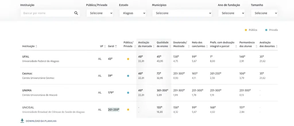 Os números indicam que Alagoas possui instituições com avaliações distintas dependendo da metodologia aplicada. Enquanto algumas se destacam pela nota máxima em infraestrutura e organização didática (Conceito de Curso), outras apresentam melhor desempenho nas avaliações externas de alunos (Enade) ou na reputação acadêmica e de mercado (RUF e Estadão).