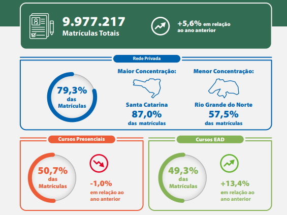 Dados recentes reforçam que a rede privada amplia sua presença no ensino superior nacional. Segundo o Mapa do Ensino Superior 2025, produzido pelo Instituto Semesp, entre 2022 e 2023 o total de matrículas no ensino superior cresceu 5,6%, com a rede privada registrando aumento de 7,3% no número de matrículas.