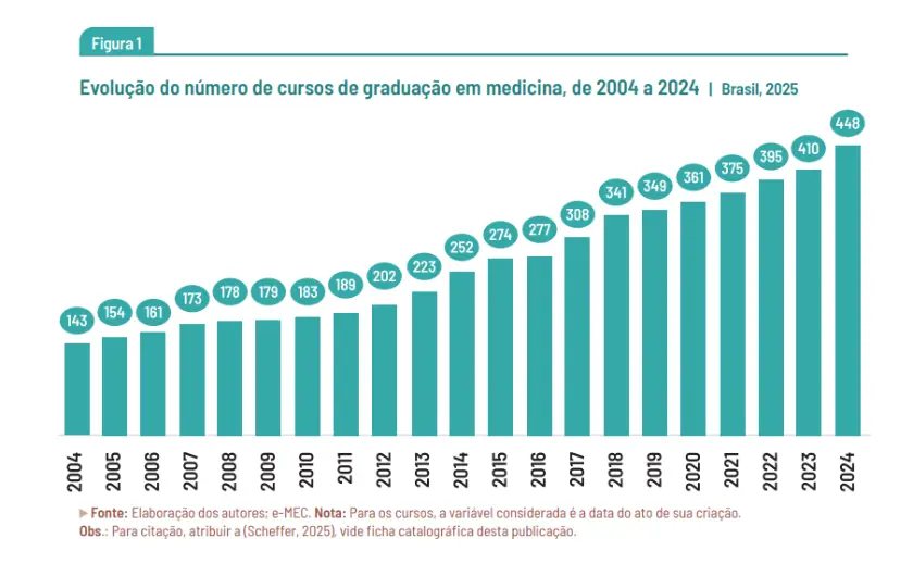 Os números mostram a dimensão dessa expansão, A demografia médica divulgada no ano passado revelou que o país saiu de 143 cursos em 2004 para 448 em 2024, alcançando 48.491 vagas anuais. O setor privado tornou-se o principal protagonista desse crescimento, concentrando 79,3% das vagas de graduação.