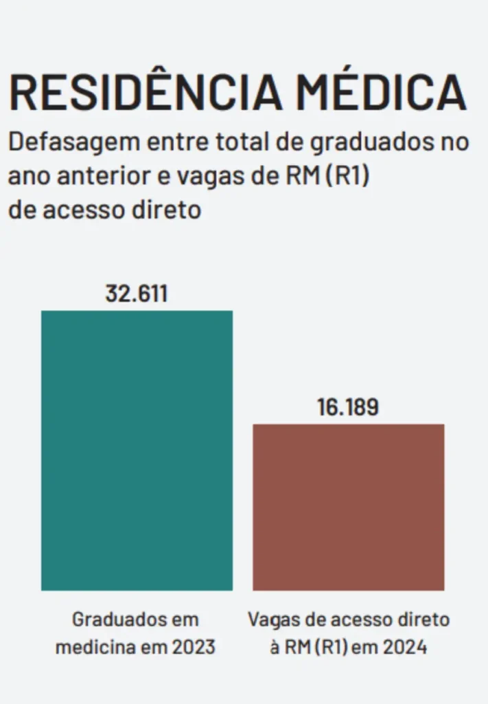 Apesar de sua importância, há um desequilíbrio entre o número de formados e a oferta de vagas. A demografia médica de 2025 mostrou que, em 2024, mais de 32 mil médicos concluíram a graduação, mas havia cerca de 16 mil vagas de acesso direto à RM (R1).