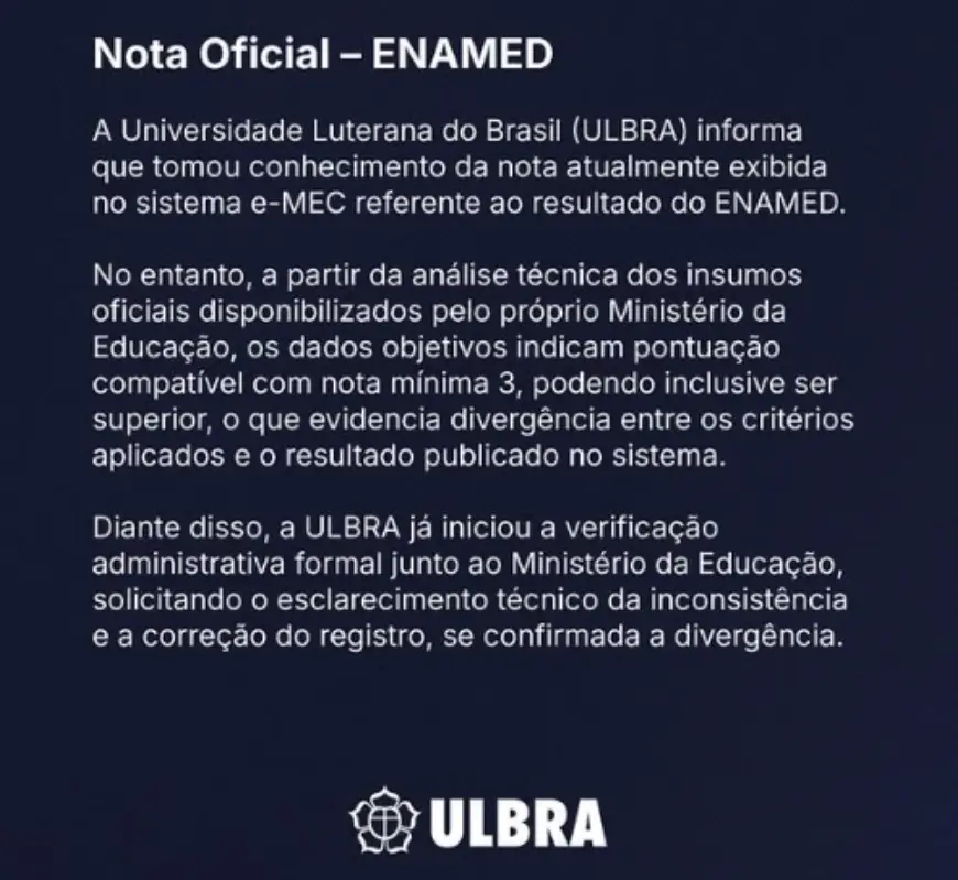 Em nota, a Universidade Luterana do Brasil (ULBRA), que obteve desempenho insatisfatório no Enamed 2025 (conceito 2), informou que identificou inconsistências entre o resultado publicado no sistema e-MEC e a pontuação obtida a partir da análise dos insumos oficiais do Ministério da Educação (MEC).