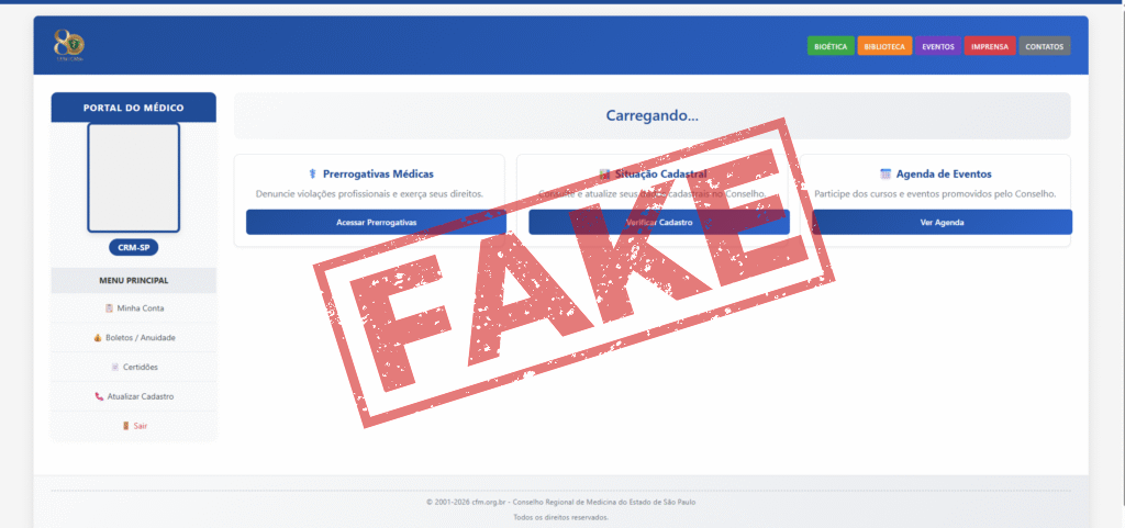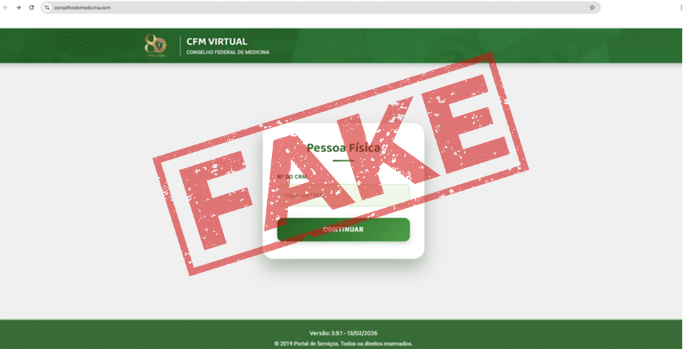 O Conselho Federal de Medicina (CFM) e conselhos regionais emitiram um alerta nesta semana informando que médicos em todo o Brasil estão sendo enganados por um site falso que simula a aparência da plataforma oficial para cobrar a anuidade profissional. A fraude visa coletar pagamentos e dados pessoais de maneira fraudulenta, usando um domínio enganoso e comunicação persuasiva por outros meios de comunicação.