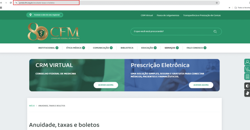 O CFM ressaltou que não envia links de cobrança por e-mail, WhatsApp ou outras mensagens diretas e que a emissão e o pagamento de anuidade devem ser feitos exclusivamente pelo portal do Conselho Federal de Medicina, acessível diretamente pelo endereço oficial, digitado no navegador pelo próprio médico.