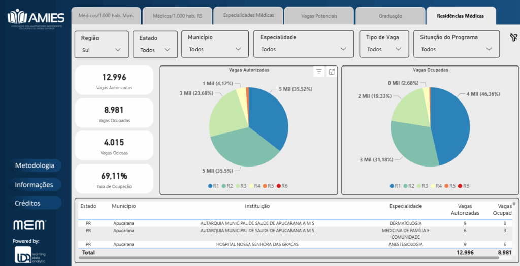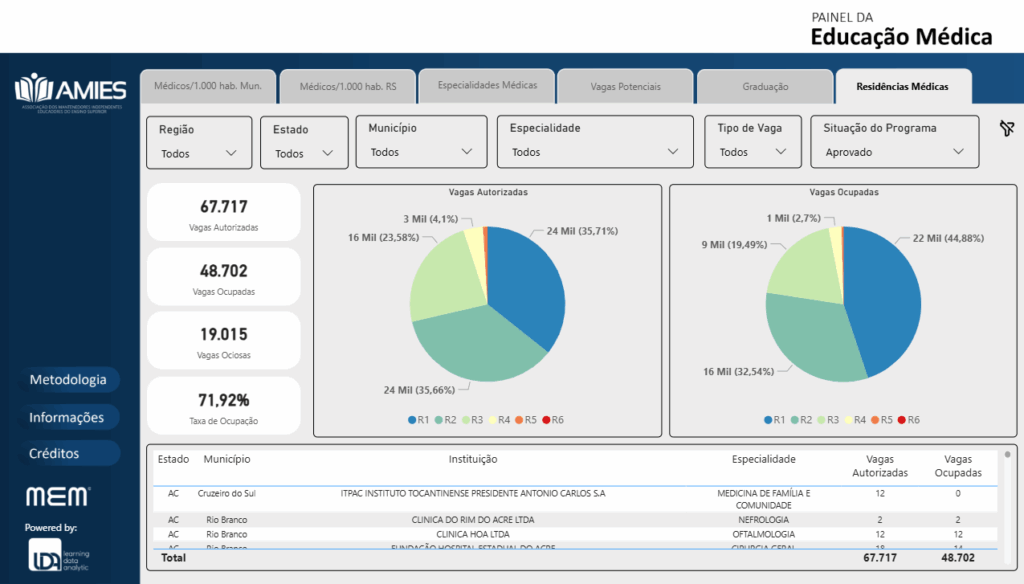 O Brasil enfrenta um quadro preocupante na formação de especialistas. Segundo dados da Comissão Nacional de Residências Médicas (CNRM), em junho de 2025 o Brasil contava com 67.717 vagas em programas cuja situação do programa era ‘Autorizado’, das quais 48.702 estavam ocupadas. Esse cenário corresponde a uma taxa de ociosidade de 28,08%, equivalente a 19.015 vagas não preenchidas, de acordo com o Painel da Educação Médica.