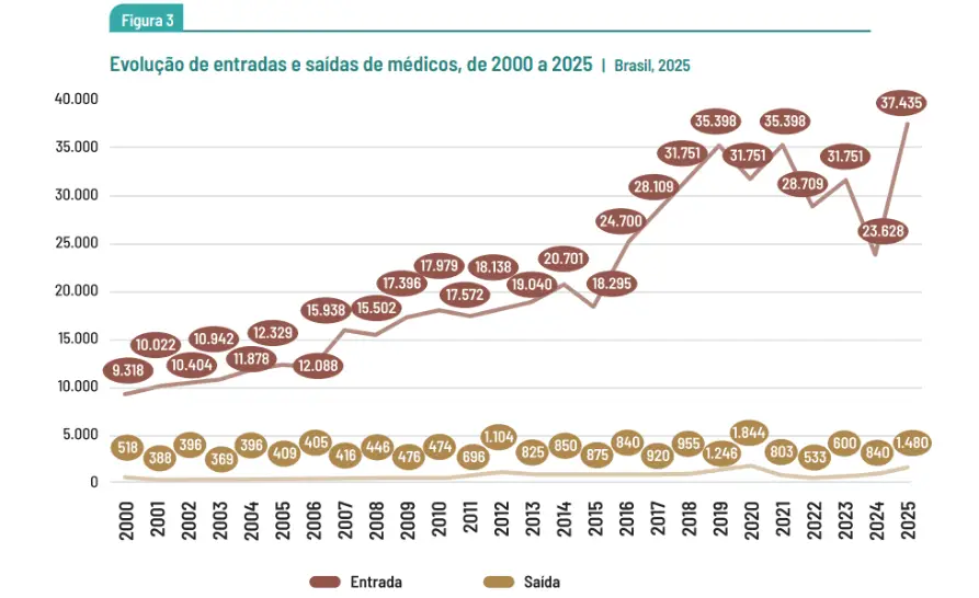 O número de novos médicos entrando no mercado brasileiro nunca foi tão alto. De acordo com a demografia, a projeção mais recente indica que cerca de 37 mil novos profissionais por ano estão passando a atuar no país, o maior volume já registrado desde o início dos anos 2000.
