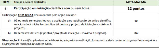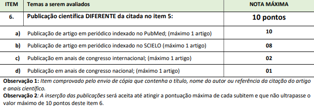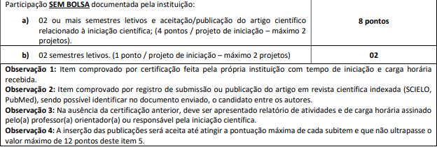 No entanto, conforme o edital, a pontuação máxima chega a 13 pontos para quem cursou em instuição com a oferta de outros programas de Pós-graduação em Medicina I, II ou III, aprovado pela CAPES. Numa comparação feita entre os itens 5 e 6, a diferença de dois pontos se dá pela participação e publicação em iniciação científica.