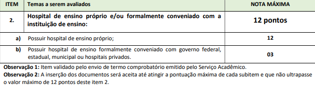 - Hospital de ensino próprio: instituição em que a faculdade mantém hospital subordinado ou integrante, utilizado para ensino, extensão e atendimento (internato, estágios, etc.) recebe 12 pontos.