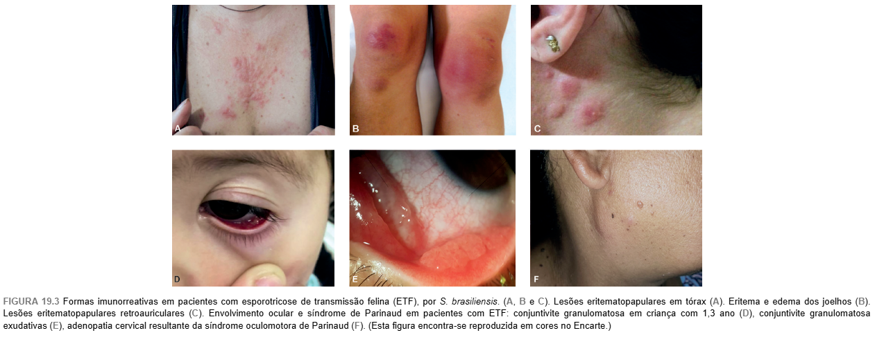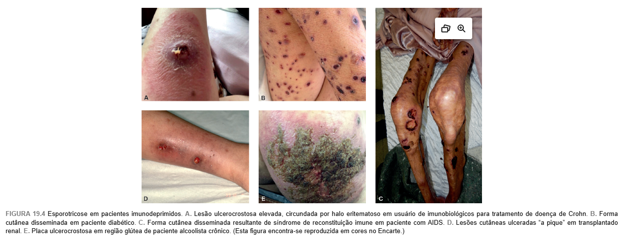 - Envolvimento Neurológico (Neuroesporotricose): Rara, mas grave. Cefaleia, febre, rigidez de nuca, vômitos, alterações do nível de consciência, convulsões, déficits neurológicos focais.