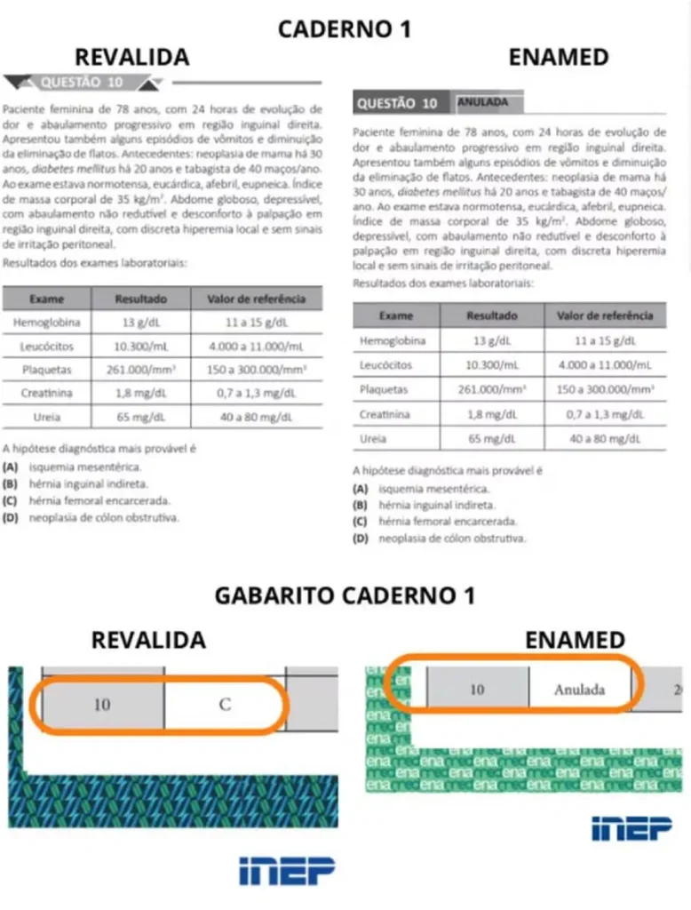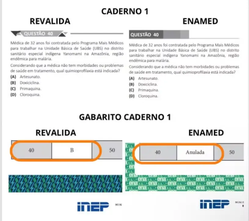 O Instituto Nacional de Estudos e Pesquisas Educacionais Anísio Teixeira (Inep) divulgou que três questões foram anuladas no Enamed, mas mantidas no Revalida, apesar de os itens terem enunciados e alternativas idênticos e de as provas terem sido aplicadas no mesmo dia.