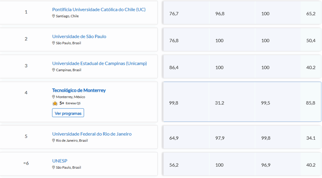Confira a posição da USP no ranking QS 2026 com outras universidade da América Latina:
